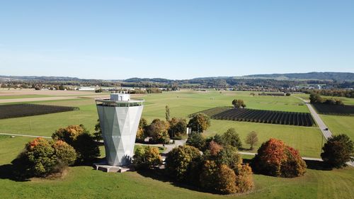 Nebst dem Hochreservoir beherbergt der Turm verschiedene Betriebsräume, ein umfangreiches Leitungsnetz und zahlreiche Kontrolleinrichtungen. 156 Treppenstufen und ein Lift führen im Inneren in die Turmkrone, in welcher ein Sitzungsraum und eine rundum laufende Terrasse vorhanden ist. Diese Plattform bietet einen einzigartigen Ausblick auf das grosse Moos, die angrenzenden Dörfer und die Jurahöhen.